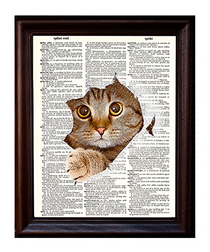 This design shows a mischievous cat peeking through the page and is printed on beautiful vintage dictionary paper. These prints are definitely a conversation starter and look fabulous as a wall hanging. Each design is carefully selected and then printed on vintage dictionary paper giving it that beautiful golden color that only comes from age. Since we use real book pages some unevenness or spotting occurs, this only adds another layer to the print, making each one truly unique. Dimensions are approximately 8" W x 10.5" L. *** Frames are not included.***Feature