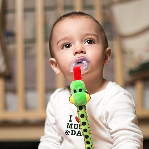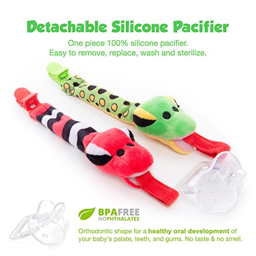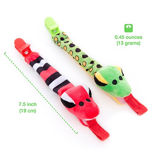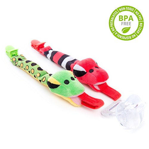 -. Feature : BabyHle Snake Clip Holder is a goofy pacifier leash to keep your baby's dummy within reach and to prevent it from falling. It consists of two cute and friendly plush snakes, one green and one red as well as a complimentary detachable hospital-grade silicone pacifier. It is also a versatile accessory for your baby. It can be used as a leash for pacifiers, teethers, rattle toys and as a hanging toy. / Detachable binky is made from 100% hospital-grade silicone, BPA & phthalates free. The pacifier has an orthodontic shape to ensure the correct growth of your baby's gums, palate and teeth. It has holes to allow natural breathing and a thin neck for a natural jaw movement. It has a drop-shaped top that allows the pacifier to naturally fit the mouth and reduce palatal pressure. It is taste and odor free and comfortable for babies to transition between the dummy, bottle and breast when breastfed. / It is ideal as a quirky prop for your baby's photo sessions or playdates with other moms and babies, and an instant hit on Instagram. It is the perfect accessory for your little one or to give as a Baby Shower Gift or Birthday Gift! Made for boys and girls from birth to the age of toddler. It is well sewed and made from durable high-quality materials. 100% safe for your baby, BPA & Phthalates Free. All features, including the length, adheres to U.S. and EN71 safety standards. / The BabyHle Snake Pacifier Leash is designed to fit your busy life. It will make it easier and less worrisome for you to keep your baby happy and entertained. It is long lasting and doesn't need to be replaced together with worn out or lost pacifiers. The snake is machine washable and will keep its quality, even after multiple washes. The pacifier can be detached and sterilized frequently with boiling water without losing its shape or composition. / Ideal for high need babies. If you find that there is only a select few brands that your picky or colicky baby is comfortable with, the dummy can be removed and replaced with your baby's favourite brand. It is compatible with pacifiers from brands like Philips Avent, Nuk, Dr. Brown, Gumdrop, Nuby, Munchkin, Mam Air, Chicco, Playtex, Gerber, Tommee Tippee, Hevea, Nip, Billy Bob and Evenflo. Also other brands with adapters like Mam Preemie and other Mam binkies, RazBaby, JollyPop, Camo etc.