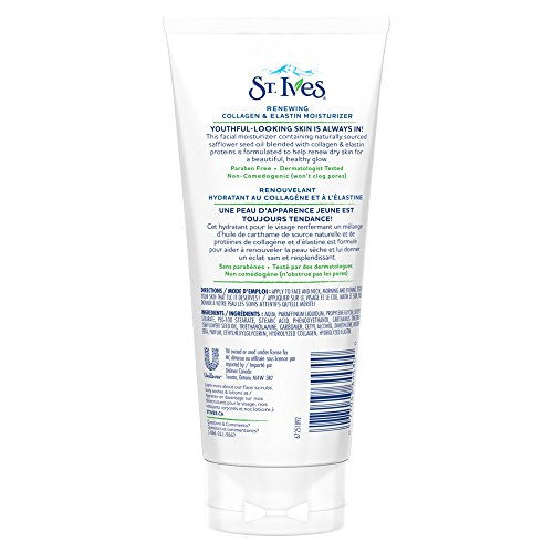 One, 5-ounce tube of St. Ives Timeless Skin Collagen Elastin Facial Moisturizer Formulated to reduce the appearance of fine lines and maintain a youthful appearance Made with collagen and elastin proteins Hydrates for visibly softer, smoother skin St. Ives formulas use effective, natural ingredients for fresher, younger looking skin