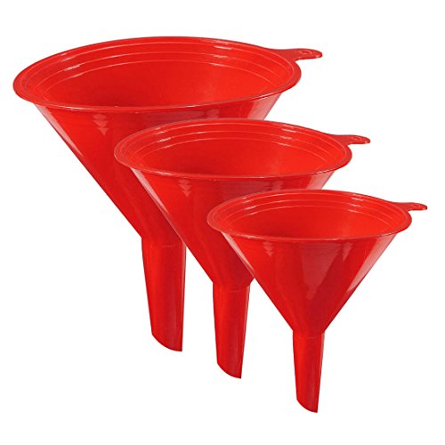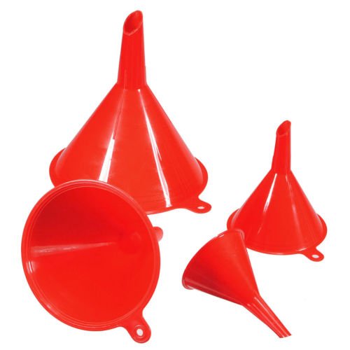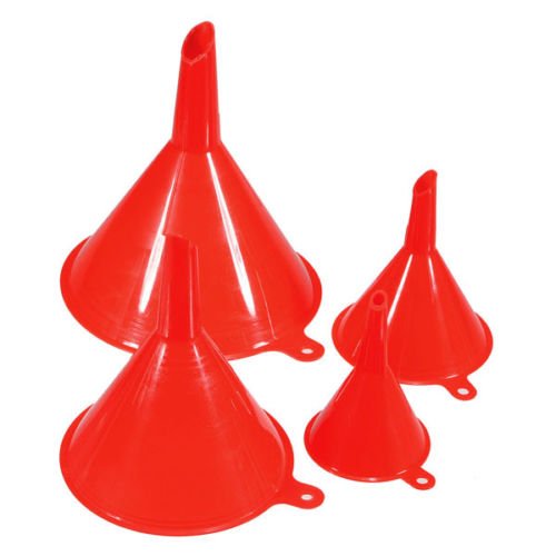 -. Feature : Material:Plastic / Color: Red / Size : Total length: 8cm(XS), 9.3cm(S), 12.2cm(M), 14.8cm(L) , Diameter: 5.3cm(XS), 7.2cm(S), 9.5cm(M), 12cm(L) / Package Included: 1 Set of 4 Pcs x Plastic Funnels / Description: Durable,lightweight,smooth,easy to handle. 4 different sizes can meet your needs of usage. Great to filter liquid,oil, etc.