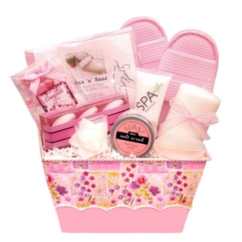 -. Feature : Pink floral tin/ planter, 3" Aromatherapy pillar Candle, Toes and Nails Bristle brush / Bath Fizzies, Ultra soft hand and face towel, Relax & read bath pillow / 8 oz Sweet Bloom Moisturizing Body Lotion, 8 oz Sweet Bloom Moisturizing Bath & Body Gel / 8 oz Sweet Bloom Body Spray, Terry cloth slippers, Relaxing gel bath mask / Don't forget your gift message at checkout, check the "This is a gift" box