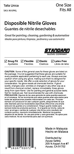 Studio : Azusa Safety Publisher : Azusa Safety Binding : Tools Home Improvement Product Description Azusa Safety N10PKL Non-sterile disposable Powder-Free nitrile gloves are excellent for food handling, janitorial, general duty, automotive, etc. Applications. Blue color is exceedingly convenient for food handling and preparation since food is generally not Blue color. Easy donning and removal even with wet hands. Nitrile is an excellent substitute for those with Natural rubber latex allergies. Convenient 10-Pack. 0