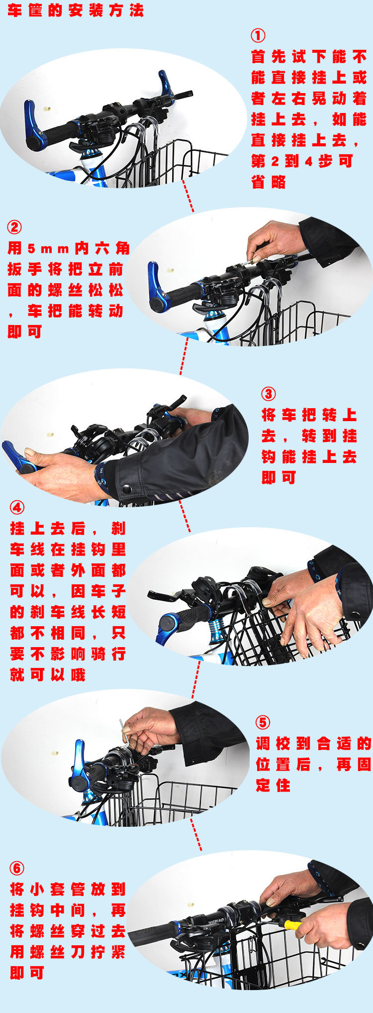 挂前面车把的话,死飞车,活飞车,自行车山地车前面是V刹的,自行车前面带有灯叉的,大行牌子的折叠车都不能安装这款车筐哦!还有,普通款选项的车筐因为挂钩空间小,也不能挂到山地车前面车把。小店另有一款升级版的挂钩可调的可以挂死飞车前面,在本店铺搜索(挂钩可调)即可搜到,或联系客服索要链接哦!