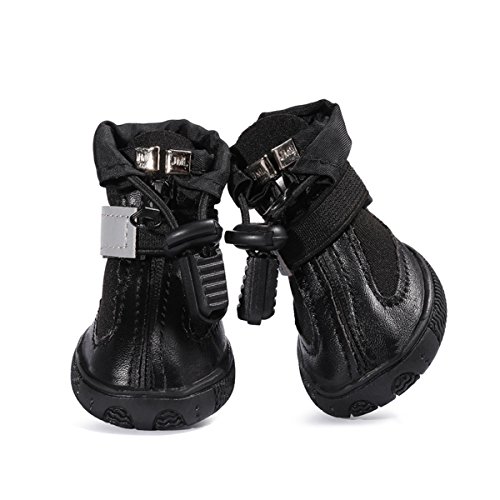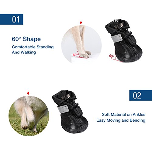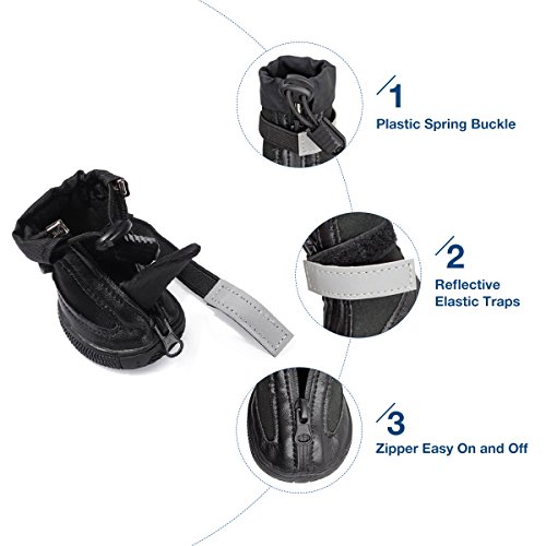 -. Feature : Material: upper is made of waterproof leather and breathable soft fabric, skid-resistant and waterproof sturdy anti-slip rubber soles / Paw Protection: keep your dog's paws warm, clean and dry, and protect your dog's paws from potentially painful hot, cold, or salty surfaces. / Flexible & Comfortable: 60¡ã shape cut for easy standing and walking, soft material cut on ankles for easy moving and bending / Easy On and Off: zipper + velcro closed, adjustable elastic velcro traps and plastic spring buckle make shoes are more flexible. / Size Measurement: please measure length and width of your standing dog's paw for fit and choose the right size according to the size chart.