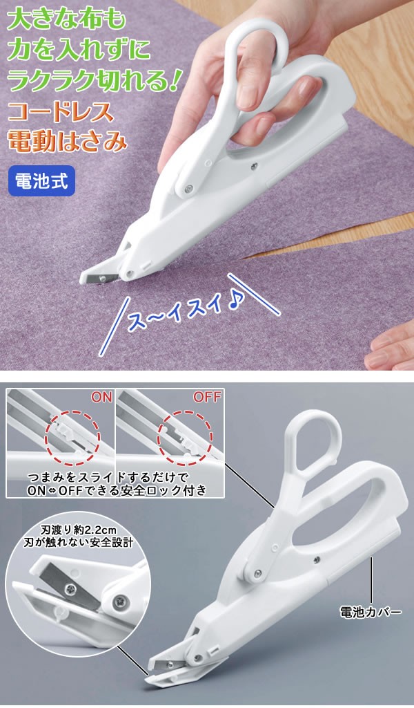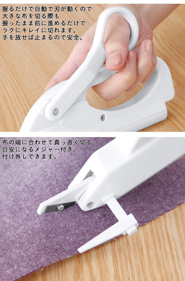 | 大きな布も力を入れずにラクラク真っ直ぐ切れる!コードレスの電動はさみです。握るだけで自動で刃が動き、手を放せば止まります。つまみをスライドするだけでON・OFFできる安全ロック付き、刃が触れない設計で安心です。布の端に合わせて真っ直ぐ切る目安になるメジャー付き。布の他、紙・ビニール・柔らかいプラスチックのカットに適しています。電池式/コードレス/電動ばさみ/裁ちバサミ/布切りはさみ/裁縫/洋裁/手芸/ソーイング/ |