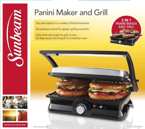 Sunbeam’s Panini Maker and Grill is designed with a floating hinge system that adjusts for variable sandwich thicknesses. The 2-in-1 functionality can be used for versatile, easy and convenient countertop cooking, allowing it to work as a standard Panini maker or a flat grill.Feature