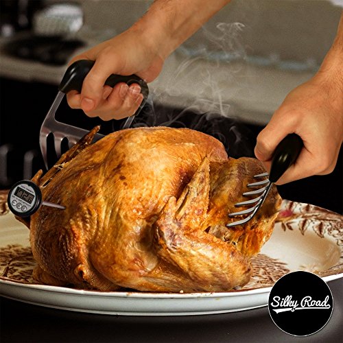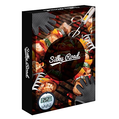 Studio : Silky Road Publisher : Silky Road Product Description CLAWS: will effortlessly shred, lift, claw, carve and toss all types of smoked or barbecue meat, beef, roasts, brisket, turkey, pulled pork, poultry and chicken with ease! NO MORE UNSAFE PLASTIC IN YOUR PIPING HOT FOOD or OVER YOUR FIRE! GLOVES: Avoid all types of burning accidents in the oven, on the grill or even boiling hot pots! Commercial grade, heat-resistant, nonslip-grip, FDA-approved silicone: essential for grilling, BBQ, smoking, cooking, baking and pulling all cuts of meat. Marinade Injector: Make the most succulent meat, packed with flavor! Professional heavy-duty construction, 2-oz capacity with measuring window. Includes thick and thin needle-heads/syringes. Burger and Slider Press / Stuffer: Perfectly and professionally shape the most succulent burgers or sliders: comes with an attachment for regular burgers and one for smaller sliders. Stuff your burgers with whatever fillings you like. Basting Brush: For brushing marinades, sauce, oil or eggs on bar-b-que, cakes or bread. Heat resistant, food-grade silicone. Flexible Skewers: 31": Longer in length and strength: Lasts longer than regular skewers. Corrosion resistant 304 stainless steel. Easy to spool ingredients onto skewers and slide them off. Grill Mats: Stop food from falling through the cracks of the grill - while still getting that classic grill pattern and taste! Non-stick, corrosion resistant, reusable, flexible, heat-resistant, dishwasher safe, washable. LCD-Display Digital Meat Thermometer: Probe measures heat up to 572° F / 300° C. Auto Shut Off and Data Memory of last measure. Includes practical sheath with clip. All the parts together add up to 18-PIECES!!! So, what are you waiting for??? Look no further - this is the ultimate all-in-one BBQ and Slow Smoking Tool Set!!! Simply Scroll Up And Click The "Add to Cart" Button NOW! You will not regret it!!! GUARANTEED. 0