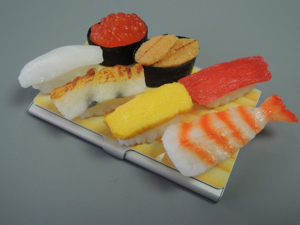 | お寿司の鉄板メニュー。いか、あなご、たまご、えび、いくら、うに、まぐろが名刺ケースに!インパクトの強さは間違いなし!お世話になった先輩や、頑張っている後輩への卒業祝いやプレゼントに♪ |