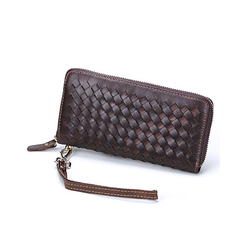 - Feature : Material: 100% First layer Cowhide Genuine Leather, Wonderful Woven Hand-Made workmanship, elegant in texture and soft to the touch, durable and luxury. / Size: 19cm×10cm×2.5cm / Come with Brand Metal Zipper with Genuine Leather Wrist Strap, Luxury, Rustproof, Smoothly and Durable. / Structure: Main Section with a zipper closure, comes with a zipper pocket and 2 big compartments which you can put it for cash and hold 5.5'' cell-phone or less , 2 receipt holders and 8 card slots. / This wallet is gorgeous with its fashionable style, it can be used in both business and casual occasion.