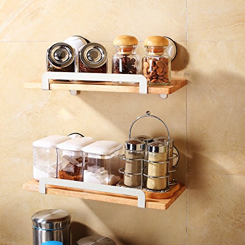 CreaTwo Wooden Spice Rack, 2 Pack Multi-funcion Wall Shelf with Suckers for Kitchen/Bedroom, Beige