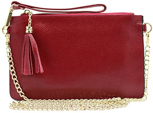 -. Brand : AMY&JOEY -. Department : womens -. Feature : 9"(L)x5.75"(H)x0.75"(W) with gold tone hardware / 3 card slots and 1 zipper pocket inside(iphone 7 plus fits) / Detachable 23" drop metal chain shoulder strap and 6" long wirslet / Soft top quality genuine leather / Hanging tassel charm as a top zipper puller -. ProductGroup : Shoes -. ProductTypeName : HANDBAG -. Title : Soft genuine leather crossbody bag clutch bag pouch with tassel