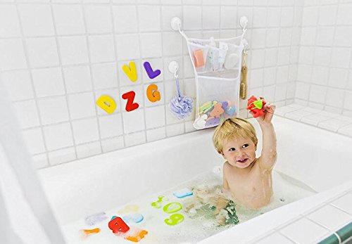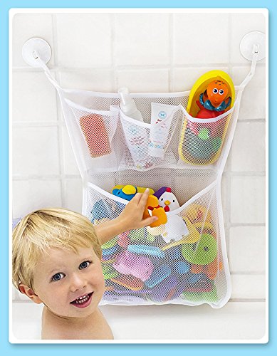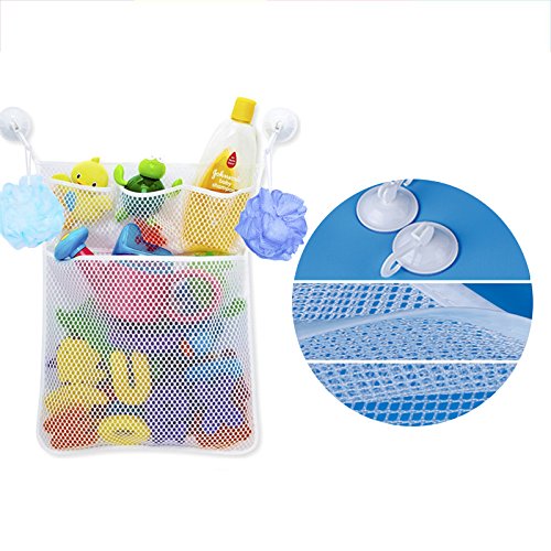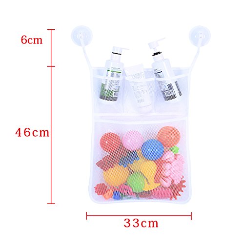- 2 x Mesh Bath Toy Organizer: 3 pockets for soap, shampoo etc. + 1 mesh fabric for baby toy, it can make toys dry quickly & prevent mildew