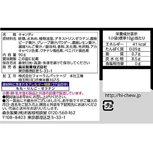 原材料:砂糖、水あめ、植物油脂、デキストリン、ゼラチン、濃縮ピーチ果汁、グレープ果汁パウダー、濃縮レモン果汁、濃縮りんご果汁/酸味料、香料、乳化剤、光沢剤、アカキャベツ色素、クチナシ青色素、ベニバナ黄色素