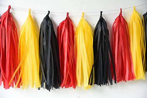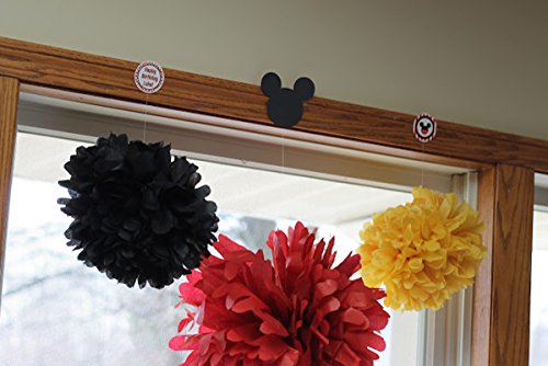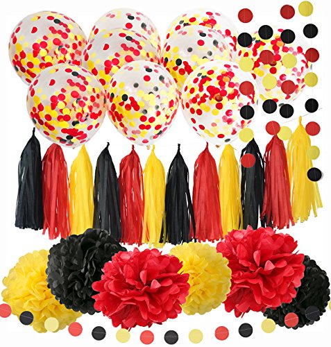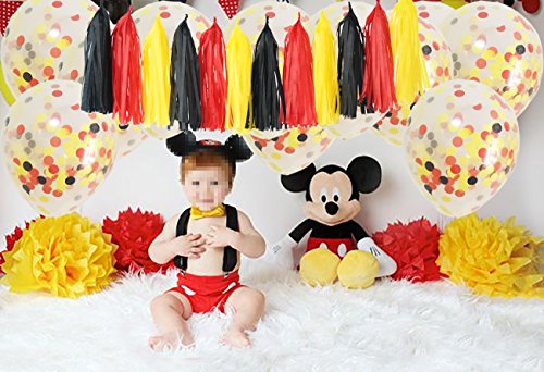Yellow Black Red baby shower decorations/Mickey Mouse Party decorations/Mickey Mouse Birthday/Mickey Decorations/Mickey Birthday Party Supplies/ Party tissue paper tassel garland Kit Package List: 10pcs yellow red black confetti ballons; 6 pcs tissue paper flowers:2 pcs yellow(1*12inch 1*10inch) 2 pcs black(1*12inch 1*10inch) 2 pcsred Tissue Paper Pom Poms(1* 12inch 1*10inch); 1 pack of yellow black red mixed color tissue paper tassel with one white ribbon and using instruction,totally 12 sheets,each color comes with 4 pcs. 2pcs yellow black red mixed color of circle dot paper garland . Paper Garland Length: approximately 6.5 feet. Tissue Paper Craft are so much fun. They appear to float in the air, adding a cheery atmosphere to any event. Perfect for a rehearsal dinner, birthday party, bridal shower,mickey Mouse garland/Mickey Mouse decorations or casual reception. 0