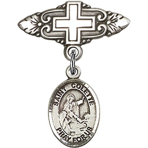 -. Title : Sterling Silver Baby Badge with St. Colette Charm and Badge Pin with Cross 1 X 3/4 inches