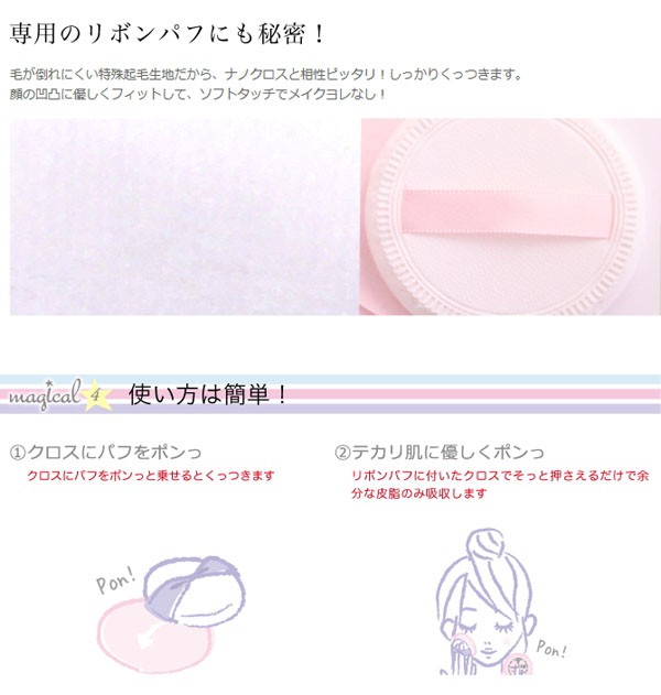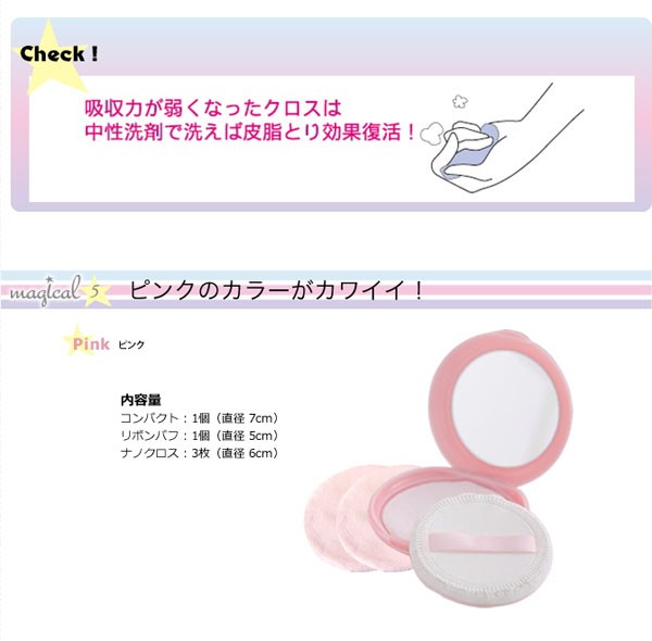 | サイズ・形状 | (コンパクト) 直径 70mm (ナノクロス) 直径 60mm (リボンパフ) 直径 50mm 製品重量 35g |