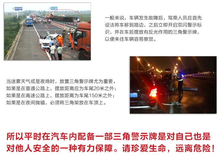 2.安装十分方便,确保你的安全.在汽车出现故障时放于汽车后方,防止后车追尾!