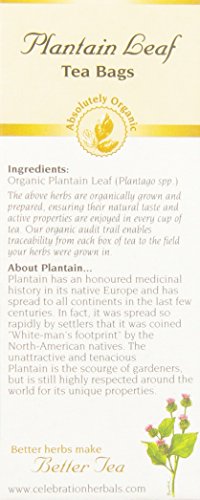 -. Binding : Grocery -. Brand : Celebration Herbals -. EAN : 0628240201720 -. Feature : Plantain has been used as a panacea in some Native American cultures and with some very good reasons / Celebration Herbals -. IsAdultProduct : 0 -. Label : Celebration Herbals -. LegalDisclaimer : This statement has not been evaluated by the Food and Drug Administration. This product is not intended to diagnose, treat, cure, or prevent any disease. -. Manufacturer : Celebration Herbals -. MPN : CEL201720 -. NumberOfItems : 1 -. PackageQuantity : 1 -. PartNumber : CEL201720 -. ProductGroup : Health and Beauty -. ProductTypeName : GROCERY -. Publisher : Celebration Herbals -. Size : 24 -. Studio : Celebration Herbals -. Title : Celebration Herbals Organic Plantain Leaf Tea Caffeine Free -- 24 Herbal Tea Bags -. UPC : 628240201720