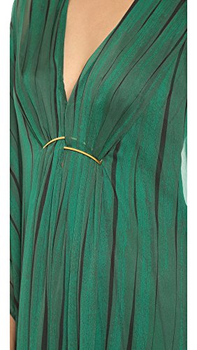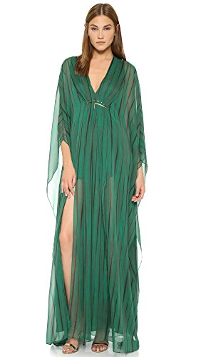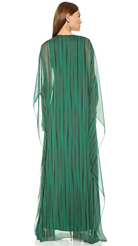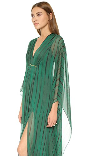 A breezy Halston Heritage gown with subtle printed stripes. Polished, crescent-shaped hardware below the V neckline gathers the front, and deep side slits accentuate the voluminous silhouette. Batwing sleeves. Lined.Feature