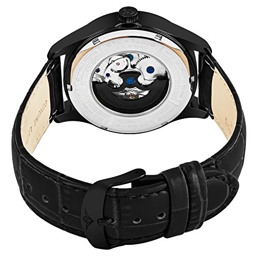 Bold black watch featuring skeletonized dial with rose gold-tone Roman numeral markers