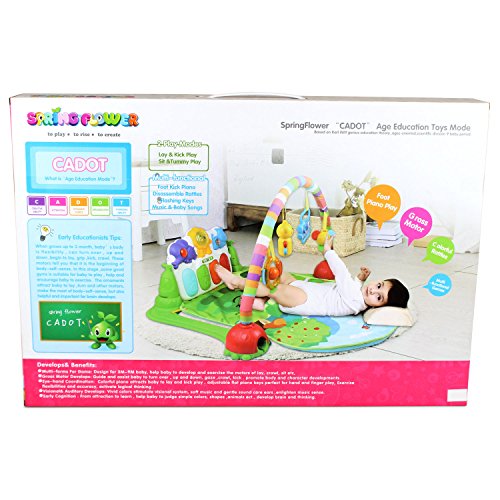 Large buttons are within easy reach of your baby's feet so they can play music and sounds themselves and learn to associate actions with results. The soft play mat ensures they're comfortable while they grab for the dangling trinket pieces above.
