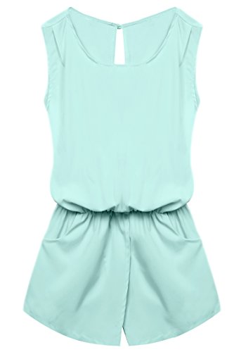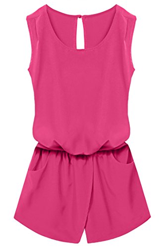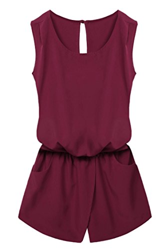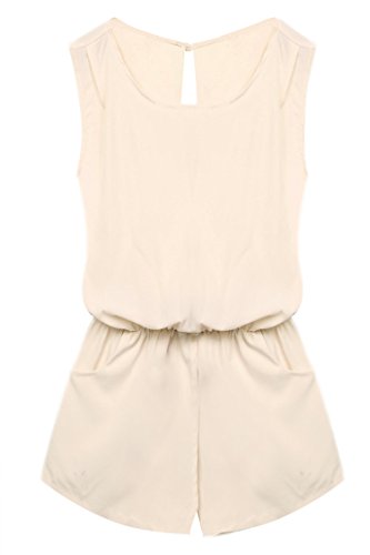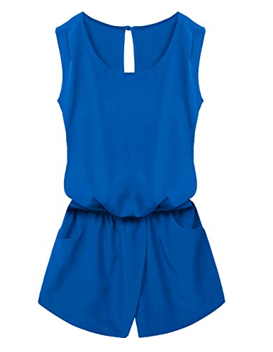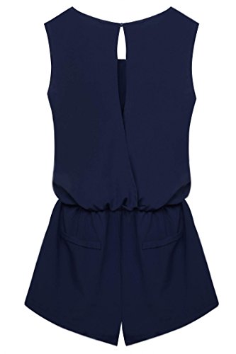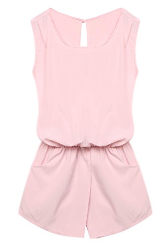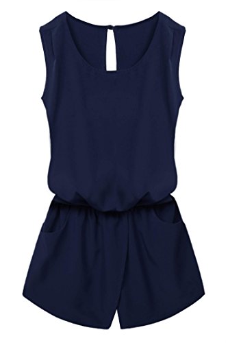 Style: Crew Neck, Sleeveless, Back neck single button, Elastic waist, Back cross backless, Front pockets, Solid Jumpsuit