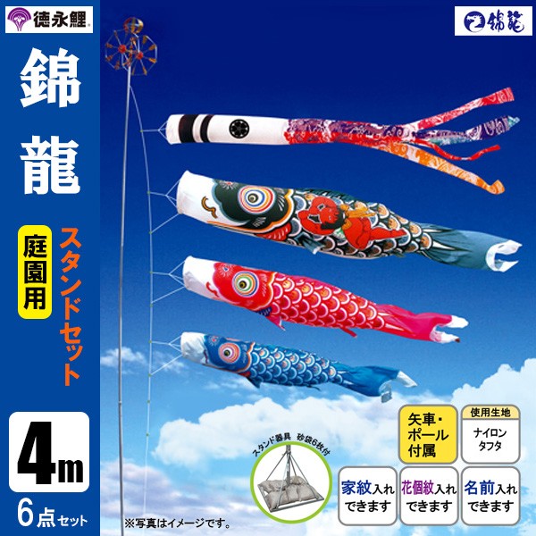 | 錦龍鯉 庭園用大型鯉のぼり スタンド砂袋式ポール付セット | 1.5m鯉3匹 | 2m鯉3匹 | 3m鯉3匹 3m鯉4匹 3m鯉5匹 | 4m鯉3匹 4m鯉4匹 4m鯉5匹 |