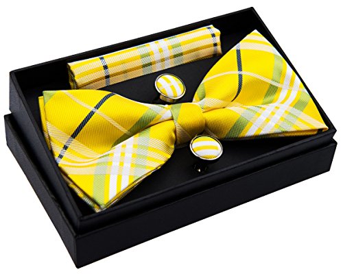 -. Title : Stylish Tartan Plaid Check Woven Pre-tied Bow Tie (5") w/ Pocket Square & Cufflinks Gift Set