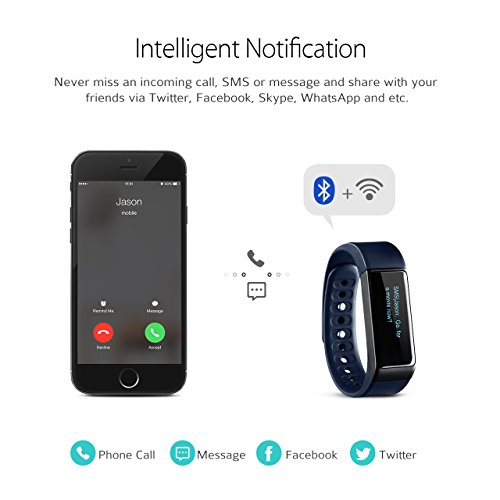 -. Feature : Sleep Monitor & Alarm Clock. Automatically track your sleep state and help you better manage sleeping. Alarm clock with vibration helps you wake up peacefully. / Large OLED Screen. Smart wristband with 0.91in large OLED screen shows time, steps, calorie, and etc. Never miss an incoming call or text notifications from Twitter, Facebook, Skype, WhatsApp and etc. Switchable horizontal or vertical display makes it effortless for you to check time. / Maximize Your Workouts. Support various sports modes like running, walking, sit-up, pushup, skipping, basketball and so on. Enable you to set a goal, track your workout status and thus gain a better understanding of your health. IP65 waterproof design allows you to fully enjoy your exercises. / Wireless Connection. Bluetooth 4.0 Technology with build-in low power consumption chip ensure fast and stable paring with your smartphones. You can synchronize data timely and track your all-day activities with long battery life. Detachable design makes it convenient to charge. Full charge takes merely 45min. / Wide Compatibility. Our wristband works with Bluetooth version 4.0 or above. (1)iOS system should be IOS8.0 or above. (2)Android system should be Android 4.3 or above.