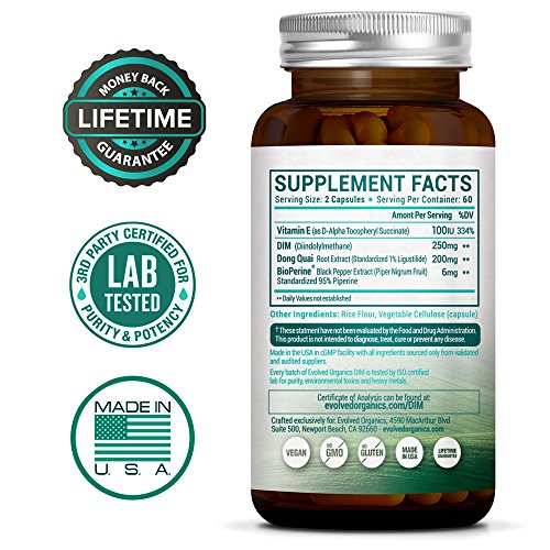 LIFETIME GUARANTEE: Soy-free, Gluten-Free, GMO-Free, Vegan and absolutely no gross magnesium stearate or titanium dioxide. Made in the USA in our NSF cGMP certified facility and validated by an ISO accredited laboratory to ensure purity and quality. If you aren't completely thrilled with your DIM purchase for any reason, simply contact Evolved Organics directly for a full refund. No Excuses, No Games. Just the best guarantee of any DIM on Amazon.