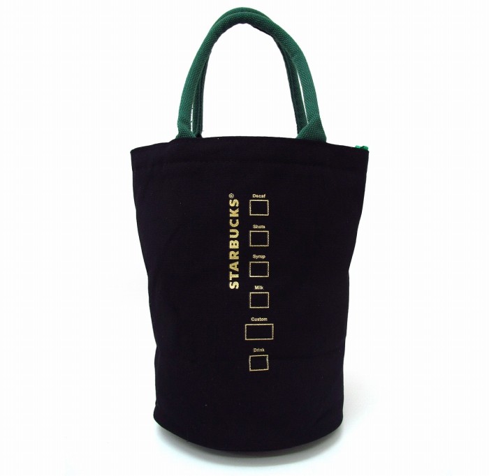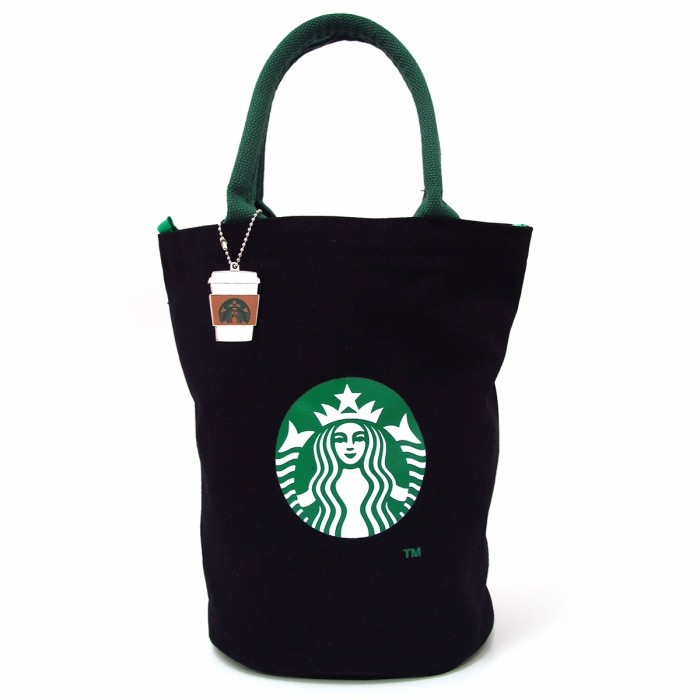 丈夫な作りのバケツ型のトートバッグ。タンブラーのキーホルダーが付いた限定バッグです!