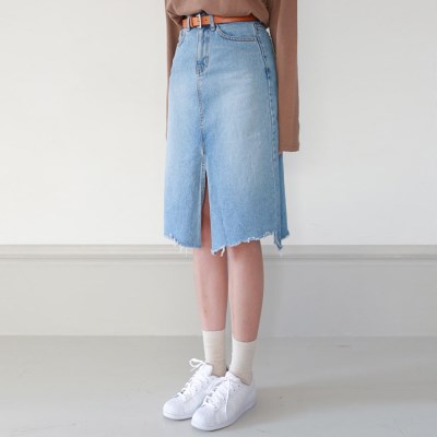 프론트 트임과 언발란스한 커팅이 매력적인 데님스커트입니다. 적당히 두께감이 있고 탄탄한 소재를 사용하여 구김이 잘 가지 않고 핏을 잡기 쉬운 아이템입니다. 미디기장의 데님 스커트가 시중에 많이 나와 있는데 그 중에서도 가장 핏이 예쁜 상품으로 초이스한 제품입니다. 적당한 길이감과 언발란스한 컷팅과 트임이 다리라인을 슬림하게 표현해줍니다. 하나쯤 소장하면 두루두루 여러 아이템과 매치하기 좋은 데일리 아이템입니다.