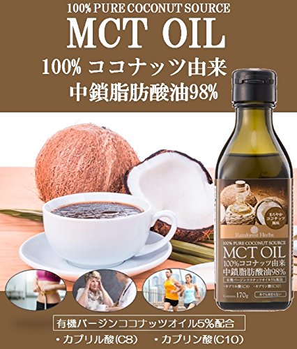 ココナッツ由来100% MCTオイル 170g (MCT OIL 100% PURE COCONUT SOURCE) 有機バージンココナッツオイル5%配合 中鎖脂肪酸油98% ココナッツ由来100% MCTオイル 170gはオーガニックバージンココナッツオイルから主に中鎖脂肪酸のカプリル酸(C8)とカプリン酸(C10)を取り出して、ココナッツオイルの特徴の一部を強めたサプリメントのような健康オイルです。 <有機バージンココナッツオイルを5%を配合> ココナッツオイルから取り出したカプリル酸(C8)とカプリン酸(C10)だけでは無味無臭ですので、食品として抵抗感をお持ちになられる方がいらっしゃいます。 ココナッツ由来100% MCTオイル 170gは食品として楽しんで頂けますように少しだけ有機バージンココナッツオイルを5%を配合し、まろやかなほど良いココナッツ風味に仕上げました。