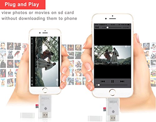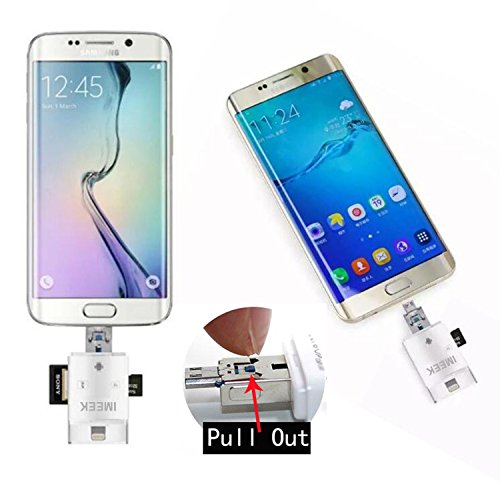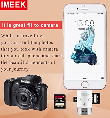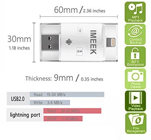 Feature: * Memory Card Reader with OTG(Android phone must with OTG function) * Backup your important Photos, Music, Videos, and Contact list * Supporting online software upgrades * Portable for business(convenient for file work) * Secured file encryption for private file * Document viewer for all major file formats * Support SD and TF card(NOT INCLUDE) * Free App from App store for communication between your Devices * Securely store and share digital contents such as movies, pictures, and music from your phone Compatitable for: *Cellphone: iPhone 7/iPhone 7 Plus/iPhone 6s/iPhone 6s Plus/iPhone 6/iPhone 6 Plus/iPhone 5s/iPhone 5/iPhone 5c/all the android phones with OTG function *Tablet: iPad Pro/iPad Air 2/iPad Air/iPad 4/iPad mini *Media player: iPod Touch 6/iPod Touch 5 *PC: With OSX, Windows, Linux operation system Compatible with these formats: .mov .mpg .swf .vob .wmv .rmvb .avi .mp4 .mkv .flv .gif .rm .mp3 .wav .m4a .jpg .gif .tif .png .bmp .txt .doc .ppt .xls .pdf support Note: Please download the app named "iDiskk Pro" from app store(IOS system). Android Smartphones do not download app,but the phone need with otg function and when you connect the card reader, please enter to the phone "file manager" to operate. Precaution Notice: * Please do not disconnect card reader during file transfer. * Please do not connect both side of card reader at the same time. * Please do not use card reader as cable. * If iOS device pops up a message said "this accessory is not optimized for this phone", just disconnect and reconnect again.* Please insert your memory card into the device before connect to your iphone or ipad. If your phone case is thick, please take it off before using the device. Package List: 1 x IMEEK Card ReaderFeature