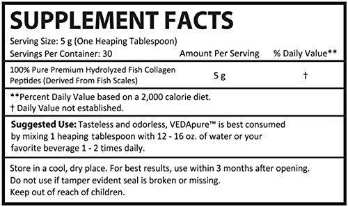 -. Binding : Health and Beauty -. Brand : VEDA Health and Nutrition -. EAN : 0865421000004 -. Feature : Contains 100% pure fish collagen manufactured exclusively from fish scales, not fish skin like many fish collagens, resulting in an easily mixable product with a clean taste and aroma. Provides superior absorption compared with other types of collagen, including collagen tablets. / Naturally restores, rejuvenates, and revitalizes our skin, hair, nails, bones, and joints by nourishing our body with the anti-aging collagen peptides it needs, from within. / Skin: Healthy, youthful skin is 75% collagen. VEDApure reduces wrinkles, eliminates fine lines, and evens skin tone. / Hair and Nails: Thickens and strengthens the thin, brittle hair and nails that occurs as we age. / Bones and Joints: Helps maintain the strength and health of our bones and joints by providing the peptides needed for proper tendon, ligament, and cartilage function. -. Label : VEDA Health and Nutrition -. LegalDisclaimer : THESE STATEMENTS HAVE NOT BEEN EVALUATED BY THE FDA. THIS PRODUCT IS NOT INTENDED TO DIAGNOSE, TREAT, CURE, OR PREVENT ANY DISEASE. WOMEN WHO ARE PREGNANT OR NURSING SHOULD CONSULT THEIR HEALTHCARE PROFESSIONAL PRIOR TO USE. -. Manufacturer : VEDA Health and Nutrition -. ProductGroup : Health and Beauty -. ProductTypeName : HEALTH_PERSONAL_CARE -. Publisher : VEDA Health and Nutrition -. Studio : VEDA Health and Nutrition -. Title : VEDApure Anti-Aging Beauty Collagen, 100% Pure Fish Collagen, 150 g -. UPC : 865421000004