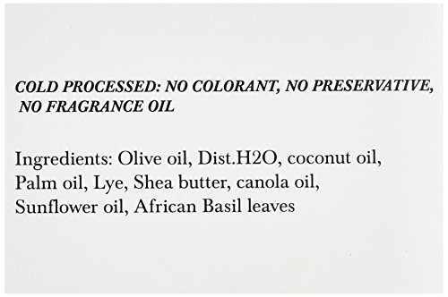 Cold produced black soap with organic or pure olive oil, coconut oil, palm oil, shea butter, canola oil and sunflower oils. It is also made with African basil leaves well known for it its anti-bacterial, anti -septic and anti-fungal properties (C N Ezekwesili Et Al).Feature