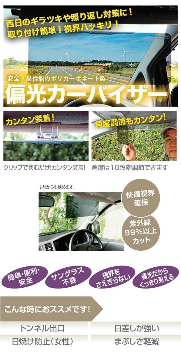フロントガラスへ差し込む朝方や夕方の太陽、雪面などの路面のギラギラ等、車に反射するまぶしい光をカットする偏光カーバイザーです。紫外線は99%以上カット!!クリップで挟むだけの簡単取り付けで、快適なカーライフを!!耐衝撃性能と耐熱性能に優れた日本製のポリカーボネートを使用。サングラスは苦手という方にもオススメです。 |