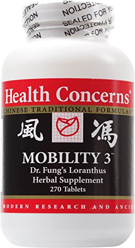 -. Binding : Health and Beauty -. Brand : Health Concerns -. EAN : 0400777601101 -. Feature : Health Concerns - Mobility 3 / Promotes maintenance of optimal joint health / Dr. Fung's Loranthus Herbal Supplement / Health Concerns is at the leading edge of research in herbal medicine and is known for bringing the centuries of knowledge amassed in the Chinese herbal tradition to the West. -. IsAdultProduct : 0 -. Label : Health Concerns -. Manufacturer : Health Concerns -. MPN : HC0137 -. PackageQuantity : 1 -. PartNumber : HC0137 -. ProductGroup : Health and Beauty -. ProductTypeName : HEALTH_PERSONAL_CARE -. Publisher : Health Concerns -. Studio : Health Concerns -. Title : Health Concerns - Mobility 3 - Dr. Fung's Loranthus Herbal Supplement - 270 Tablets -. UPC : 767674596146