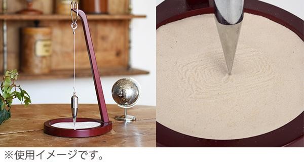 | 一定のリズムで揺れ動く振り子の動きと、その振り子が描いていく砂の模様を眺めて過ごす贅沢な時間をお楽しみください。シンプルさと奥深さを堪能できるインテリアグッズです。 |