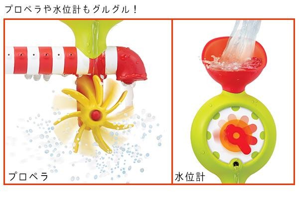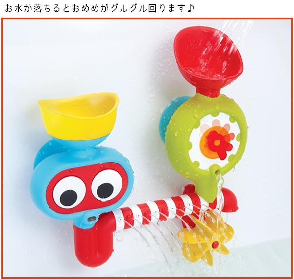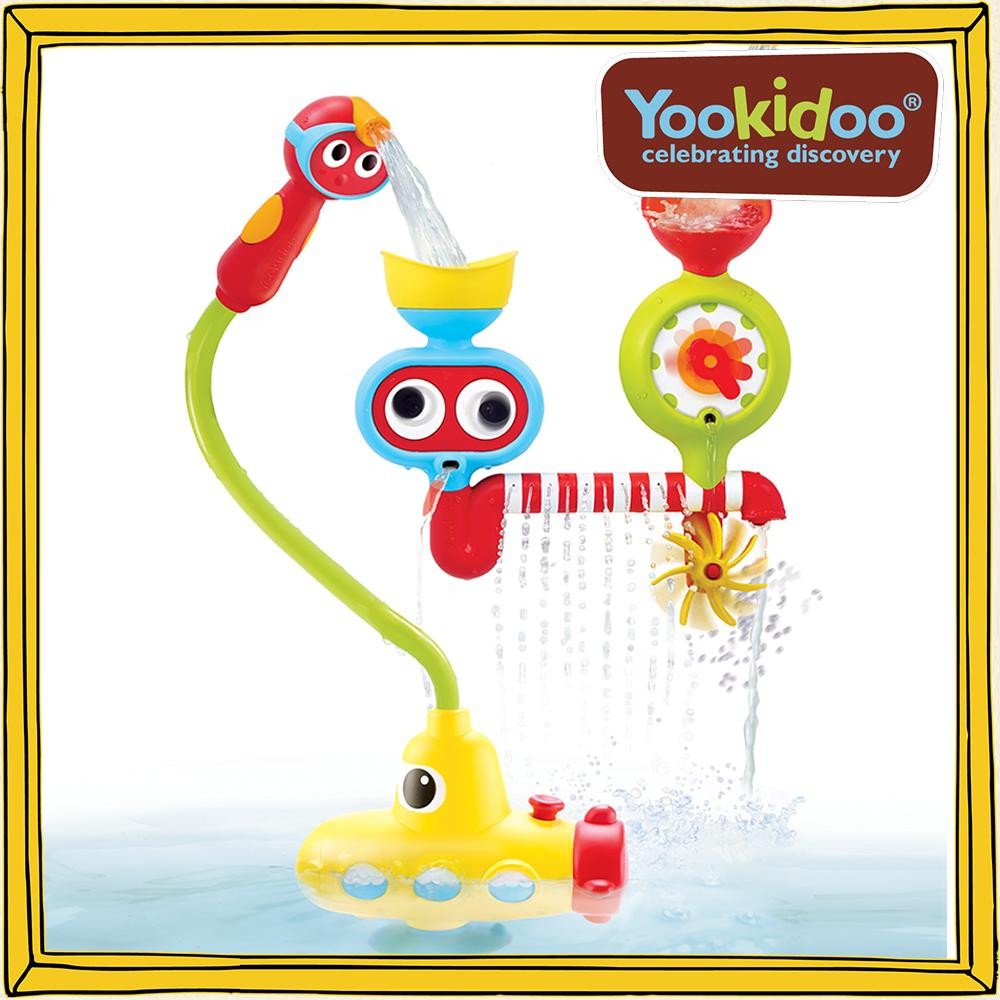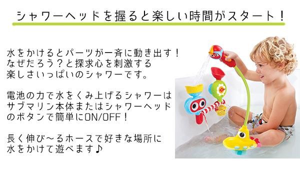 電池の力で水をくみあげて、シャワーヘッドから水が流れるお風呂おもちゃです。シャワーのON&OFFはサブマリンのボタンを押すか、シャワーヘッドを握ることで操作できます。本体を浴槽の側面に吸盤で設置し水を注ぐと、注いだ場所によっておめめや水位計がクルクル回るなどの様々な工夫されています。 |