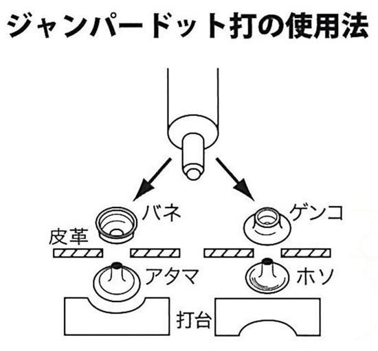| セット内容 | ●ジャンパードット打(中) ※対応金具:中(Φ13mm)No.1064 ●ハトメ抜き(10号、Φ3.0mm) ●打台 |