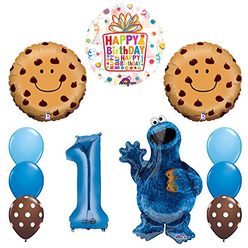 -. Feature : (1) 35 inch Jumbo Cookie Monster Shape Foil Balloon / (1) 34 inch Giant Blue Number 1 Shape Foil Balloon / (2) 21 inch Chocolate Chip Cookie Balloons / (1) 26 inch Birthday Present See-Thru Balloon / (6) 11" Qualatex Latex Balloons 2- Pale Blue, 2- Dark Blue and 2- Brown with White Polka Dots.