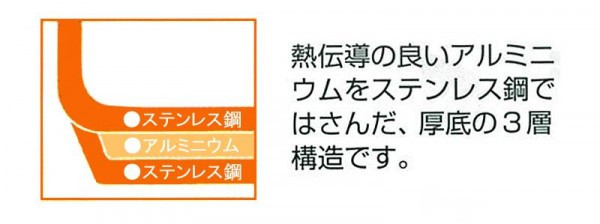 | 素材・材質 | 本体:ステンレス鋼(クロム14%) はり底(厚さ2.5mm):アルミニウム・ステンレス鋼(クロム11%) 取っ手:フェノール樹脂(耐熱温度150度) |