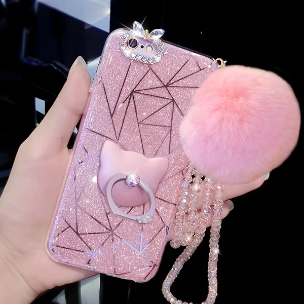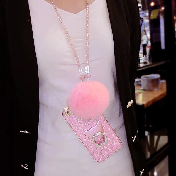 Features:Diamond Cute Cat Ring Real Rabbit Fur Ball Crystal Chain