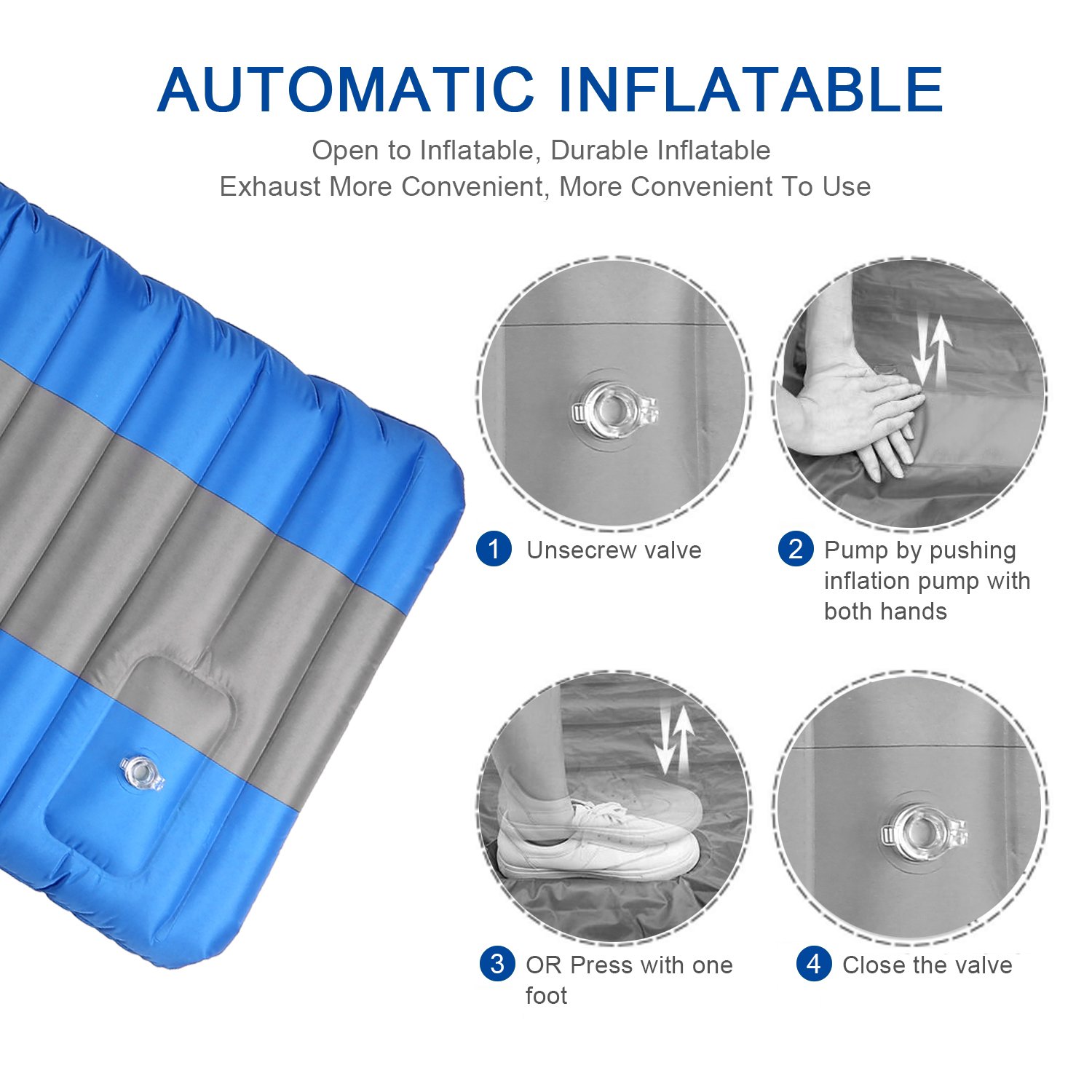 Expand the mat, open the valve and inflate by just stepping on for 2-3 minutes.