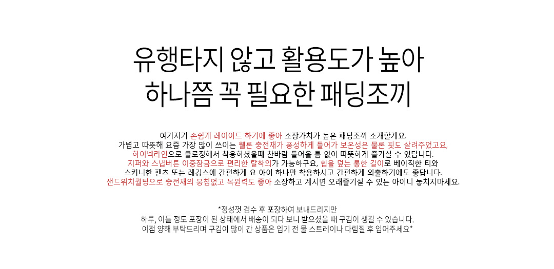 | 소재(Material) | 겉감폴리(polyester/)100%안감폴리(polyester/)100%충전재웰론(wellon)100% |