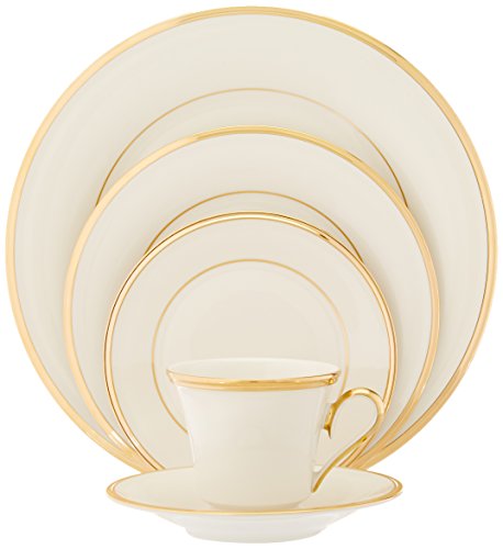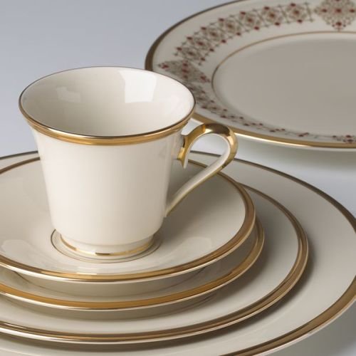 Amazon.com Review Refined and classic in its styling, the gold-banded Eternal fine china from Lenox lends instant elegance to any dining occasion. The ivory pieces feature a 1/4-inch rim of 24-karat gold, a narrow interior band of gold, and a gleaming glaze overall. An indentation in the rim gives dimension to the gold's shine, and the interior band adds a touch of refinement. The teacup is banded at rim and foot, as well as along its delicately curved handle. The five-piece setting includes a 10-3/8-inch dinner plate, an 8-1/8-inch salad/dessert plate, a 6-3/8-inch bread and butter plate, a 6-1/8-inch saucer, and a 6-ounce teacup. The pieces are safe for the dishwasher and are covered by a lifetime replacement policy. Lenox also makes gold-banded Eternal serveware and accessory pieces. --Emily Bedard What’s in the Box 1 place setting. Place setting consists of: 10-3/8-inch dinner plate; 8-1/8-inch salad/dessert plate; 6-3/8-inch bread/butter plate; 6-ounce teacup; 6-1/8-inch saucer. 5 pieces total. 0