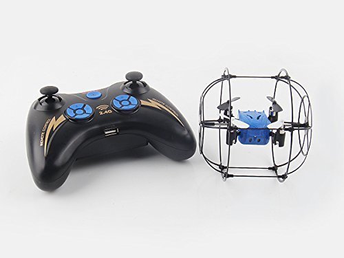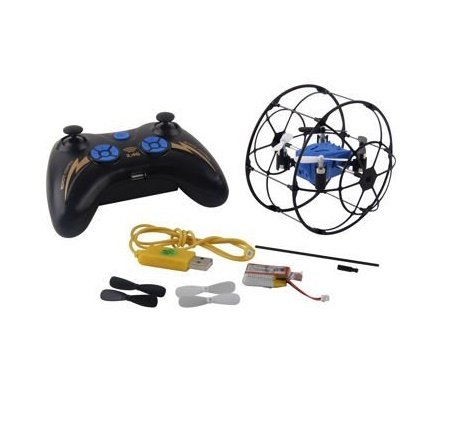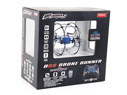 This D63 DRONE RUNNER is the ultimate flying drone. With a rolling cage around the drone, you can safely fly it indoors and roll, bump and bounce off of floors, walls and ceilings. Equipped with 2.4 GHZ digital remote you can fly up to 20 of these drones together. Range is approximately 100 feet and features 2 speeds for both indoor and outdoor flight. It features a 6 axis gyro making it very stable and easy to fly, and has a 4.5 channel 8 direction flight. This drone is a blast to fly and fun for pilots of all ages.Feature