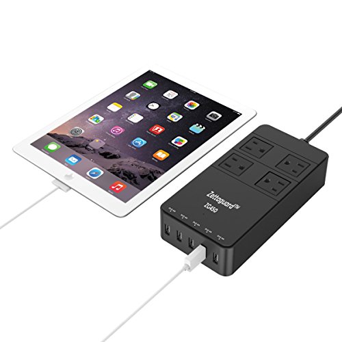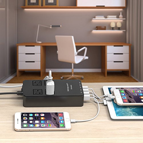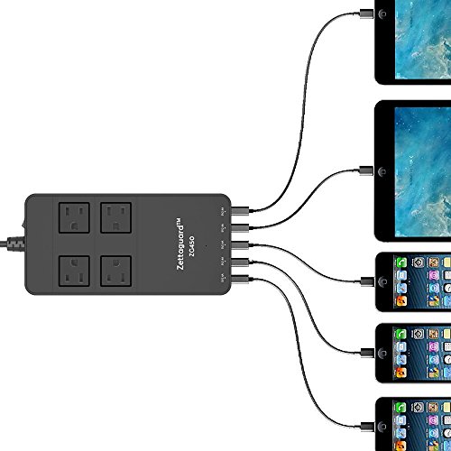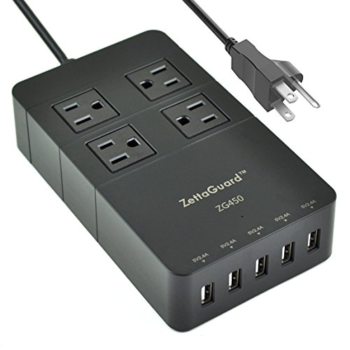 The Zettaguard desktop space-saving 4-Outlet surge protector / power strip with USB charging station is the perfect solution for charging 9 devices simultaneously via 4 AC sockets and 5 USB ports.