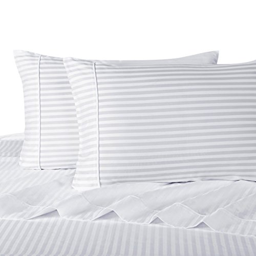 Stripe White Split-King: Adjustable King Bed Size Sheets, 5PC Bed Sheet Set, 100% Cotton, 300 Thread Count, Sateen Striped, Deep Pocket, by Royal Hotel